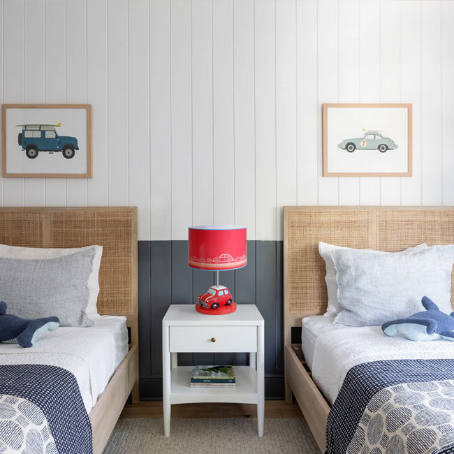 Lámpara de sobremesa de cerámica con forma de auto y con pantalla impresa.